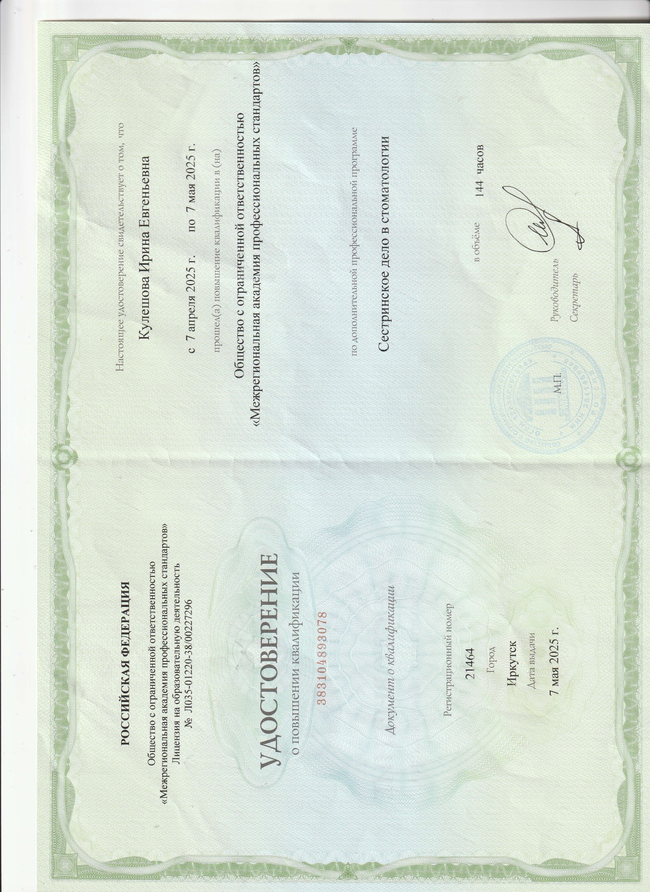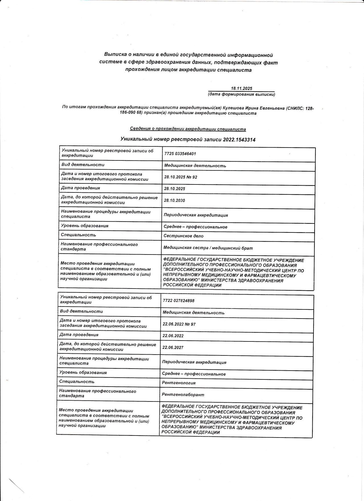 Медсестра Кулешова Ирина Евгеньевна